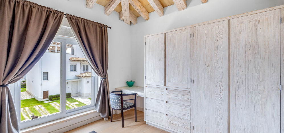 The house has three bedrooms, each with an en-suite bathroom. Upon entering the open-plan living area, where the kitchen is part of the same space, the white-stained wooden beams and ceilings create the feeling of an even larger space, thanks to their high ceilings and the opening to the rear garden.