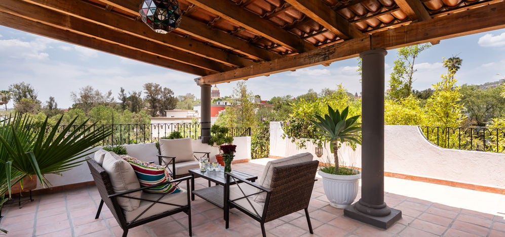 This property offers incredible versatility, whether envisioned as a luxury home, a boutique hotel, or a multi-unit rental property. It boasts multiple plant-filled patios and a charming covered rooftop terrace with breathtaking views of the Parroquia and surrounding churches. The serene ambiance is enhanced by the soothing sounds of two elegant fountains, creating a peaceful retreat.